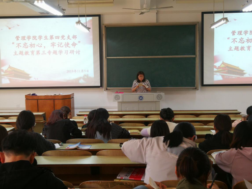 2019年11月5日下午16:00-17:00,管理公司员工第四支部全体党员在支部书记周艺的带领下,在新校区D403开展了“不忘初心、牢记使命”主题教育第三阶段的集中学习。