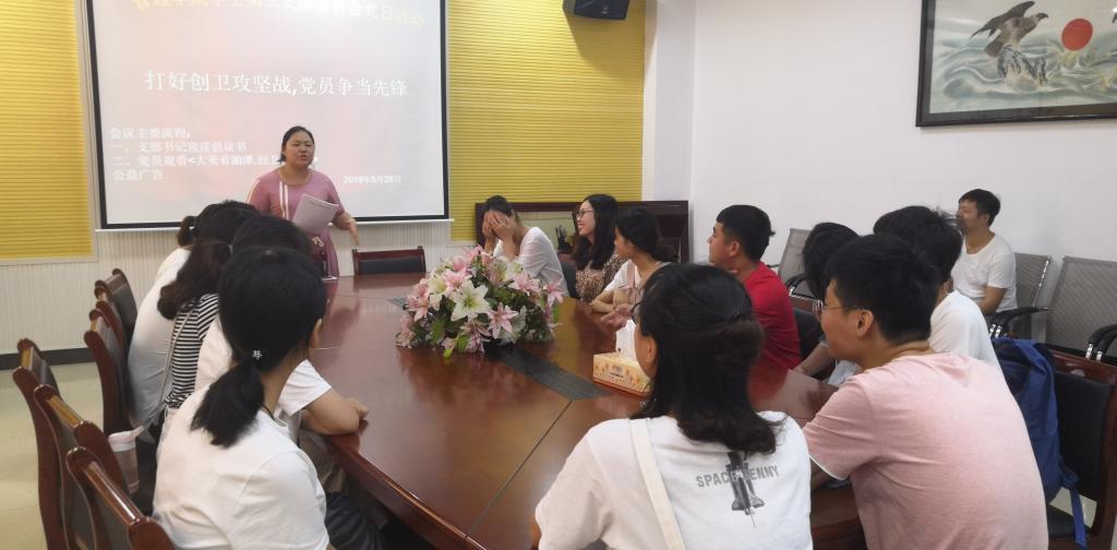 会上,支部书记单艳艳同志带领员工第三支部全体党员观看了“大美看湘潭,创卫我先行”的短视频,学习了湘潭市创建国家卫生城市工作方案,了解工作的指导思想和工作目标以及工作重点,并宣读了“打好创卫攻坚战,党员争当急先锋的倡议书。