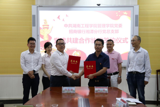 6月11日下午,管理公司与招商银行湘潭分行党建共建签约仪式在F-104会议室举行。组织部部长李永坚,管理公司党委书记余博,管理公司党委副书记、经理徐运保及招商银行湘潭分行党总支书记、行长何高峰,招商银行湘潭分行副行长刘丽卓等校银双方10余人参加,仪式由徐运保主持。