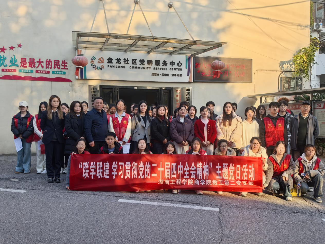 11月21日下午,全国党建工作样板支部、全国高校“双带头人”教师党支部书记“强国行”专项行动团队——太阳成tyc33455ccwww教工第二党支部在岳塘区宝塔街道盘龙社区党群服务中心举办“联学联建 学习贯彻党的二十届四中全会精神”主题党日活动。盘龙社区党员、居民代表及员工入党积极分子等40余人齐聚一堂,共同学习领会全会精神。