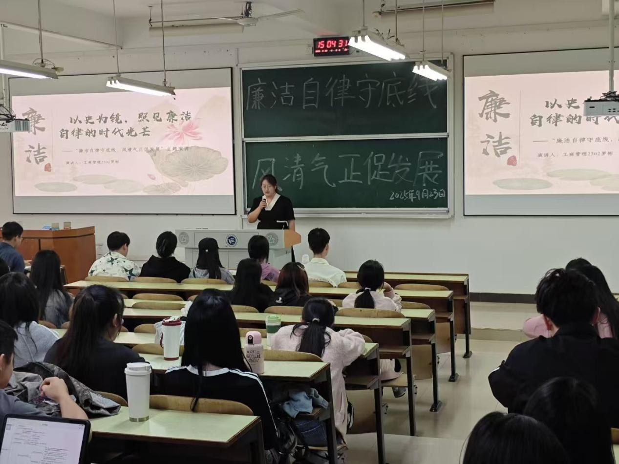 本次演讲紧扣商科专业特质,选手们围绕 “财经行业廉洁从业”“学术诚信与职业操守”“青年党员的廉洁担当” 等核心话题展开分享。有的结合金融、会计等专业案例,剖析职场廉洁风险与防范之道;有的讲述身边廉洁榜样故事,诠释 “诚信为本、廉洁为魂” 的商科精神;还有的立足青年视角,畅谈如何在学术研究、实习实践中坚守底线、拒绝诱惑。选手们语言铿锵有力、情感真挚饱满,既有理论深度,又有实践温度,赢得现场评委与观众的阵阵掌声。评委团从主题契合度、语言表达、逻辑结构、现场感染力等维度进行综合打分,最终评选出一等奖1名、二等奖2名、三等奖3名及优秀奖4名。