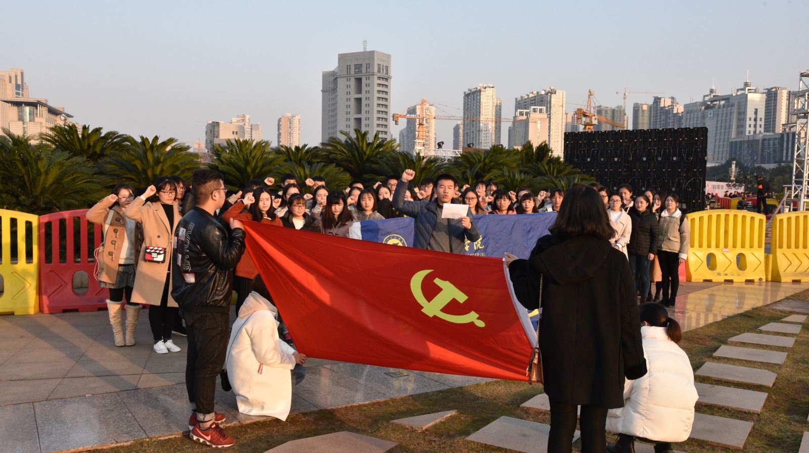 活动进入正式宣誓阶段。:全体预备党员面对党旗,背向毛主席雕像,在钱书记的带领下,整齐而又激昂的声音回荡在东方红广场上:“我志愿加入中国共产党,拥护党的纲领,遵守党的章程,履行党员义务,执行党的决定,严守党的纪律,保守党的秘密,对党忠诚,积极工作,为共产主义奋斗终身,随时准备为党和人民牺牲一切,永不叛党。”誓词宣读完毕,激动之情仍久久未散。