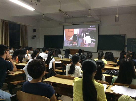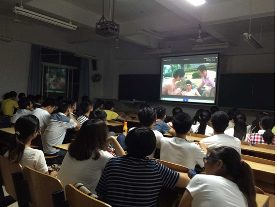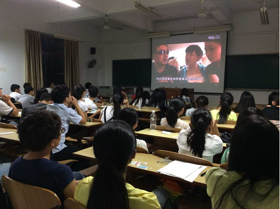辅导员老师和员工会评估中心的干部干事们一起统筹安排,由于涉及到40个班级,共安排三个晚上进行播放,各班级分批观看,员工干部们负责播放视频和组织考勤,要求每位员工必须认真观看,并写一篇观后感。6月8日晚上7点,组织14个班级第一批观看。