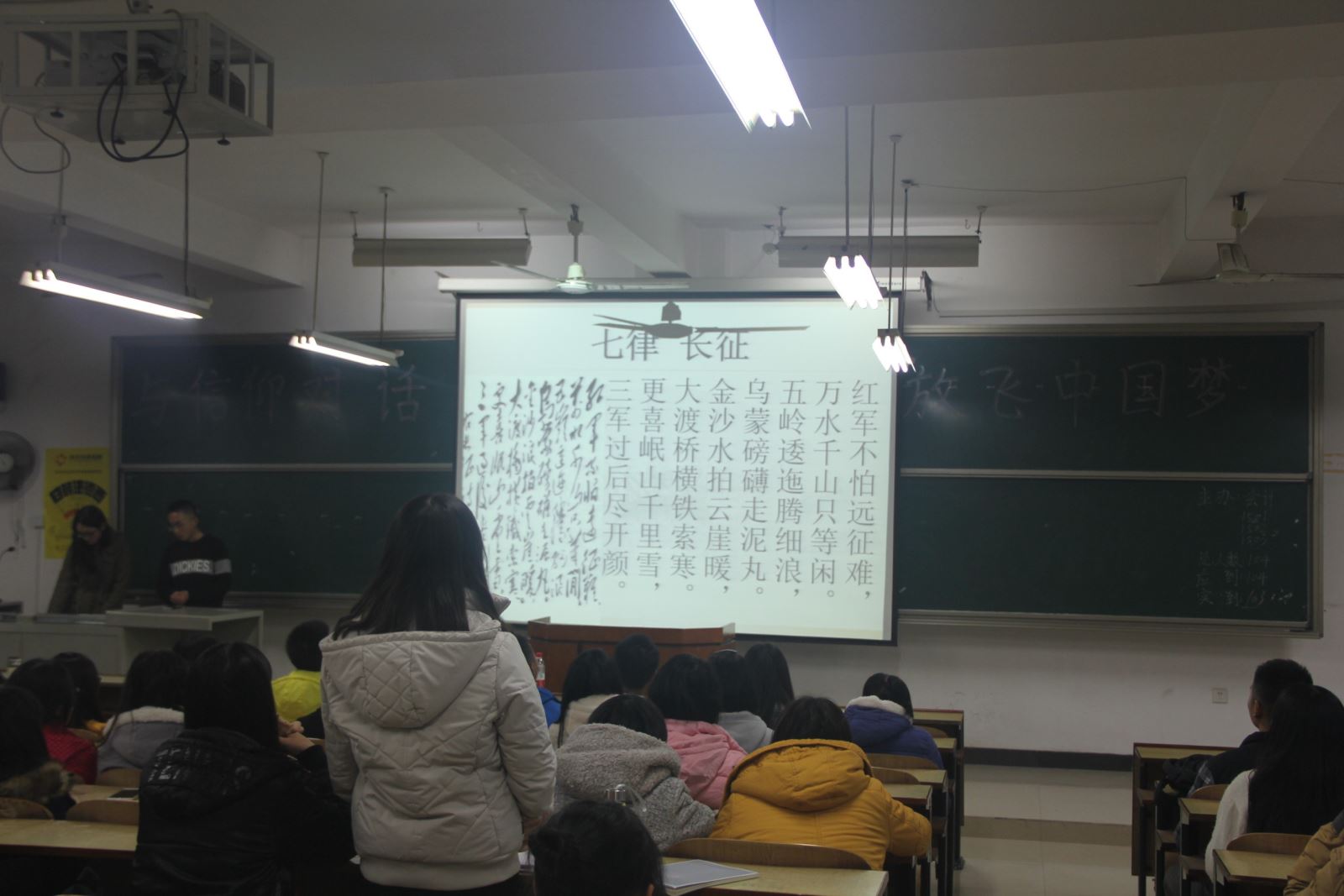 各班级在不同教室开展本次团日活动,精心布置的会场和张贴的海报将现场的气氛烘托的淋漓尽致,整个过程进行地井然有序。大家围绕“什么是信仰”,“信仰的力量”等问题展开积极的讨论,各抒己见,相互交流。问题抢答,团歌合唱等活动不仅活跃了现场气氛的,同时也让大家对本次活动的主题及深刻内涵有了更真切的体会与领悟。