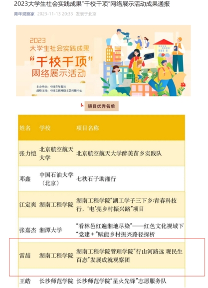 2023年暑期“三下乡”社会实践活动启动以来,观察团深入农村开展调研,多维创新点频出团队活动被人民日报、中国网、中国青年网、新湖南、红网等多家主流媒体报道,社会反响突出,实践团获评湖南工程公司暑期“三下乡”社会实践活动先进实践团。此次员工团队在“三下乡”社会实践活动中获奖是学对员工素质教育成果的重要体现让理论知识落地的结果,也是各位参与师生汗水和智慧的结晶。