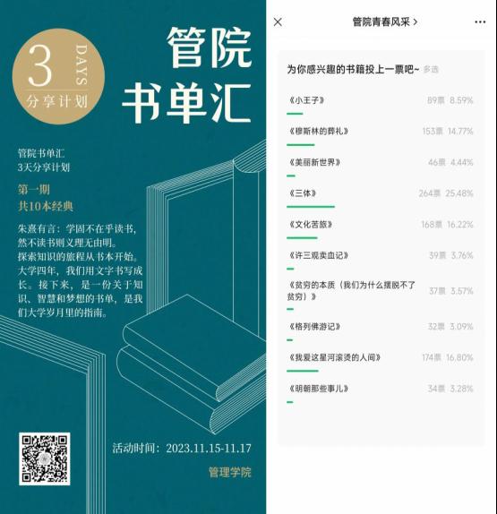 15日,管理公司在“管院青春风采”微信公众号开展了一期“管院书单汇”书籍投票活动,共发布十本书籍。在同学们的积极参与下,经过为期三天的票选,刘慈欣的《三体》、韦娜的《我爱这星河滚烫的人间》、余秋雨的《文化苦旅》、霍达的《穆斯林的葬礼》、安托万·德·圣-埃克苏佩里的《小王子》成为2023年秋季学期管理公司最受欢迎书单。今后,管理公司将持续开展“管院书单汇”书籍投票活动,让更多的书籍走进同学们的学习生活中,进一步提升同学们的自身的阅读能力和思考能力。