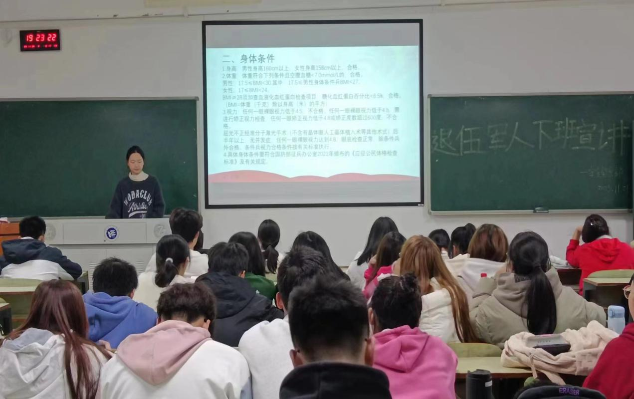 为深入贯彻落实习近平强军思想,积极落实国家征兵工作要求,帮助老员工了解征兵政策,管理公司于2023年11月29日晚组织召开征兵政策宣讲会。本次活动以“当立鸿鹄志,砥砺强国梦”为主题,在主校区和南校区的各专业晚自习教室同时开展,由员工联合组织安全督察部负责部署,退伍军人进行宣讲,全体大一员工参会。