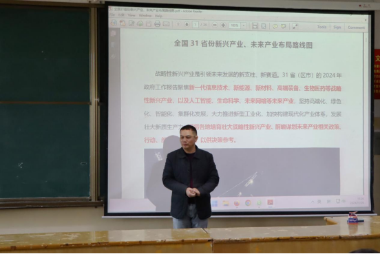 徐运保介绍了管理公司基本情况和人才培养成效,并以某网站界面的介绍为切入点,以经济的眼光畅谈中国经济产业布局。徐运保通过自己实地走访调研的具体感受,详细阐述了全国31个省、自治区、直辖市新兴产业、未来产业战略布局情况,让同学们对我国各地产业布局状况有了更直观、更深刻的理解,对本专业未来就业前景和就业方向有了更为深入的认识。