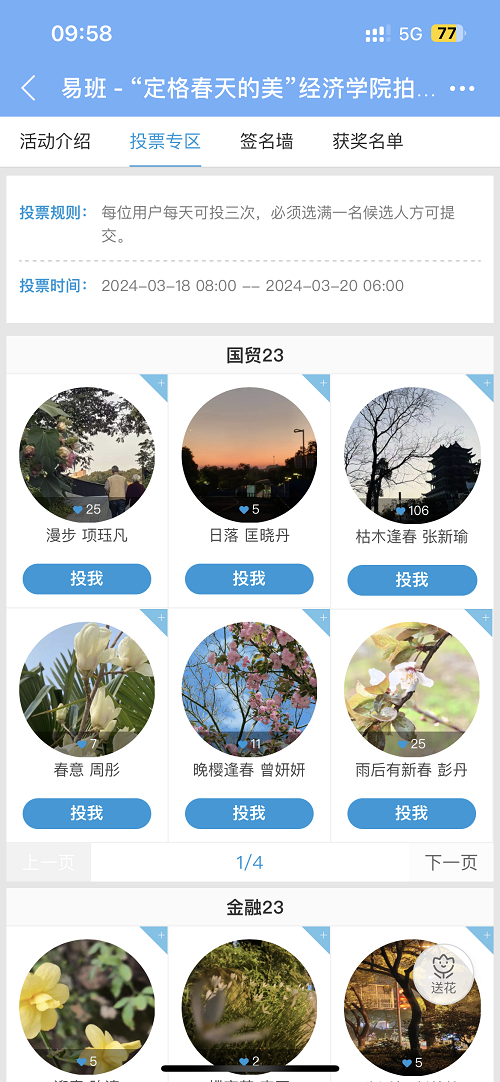 活动期间,同学们踊跃报名,积极投稿,通过摄影作品展现春天校园里的美景,生动地诠释了对美的理解。此次活动依托易班app平台开展,宣传部干部把参赛同学拍摄的照片上传至易班平台,开放投票通道,最终以票数决出本次比赛前六名,经济学2301班郭晨曦获得一等奖,经济学2101班陈美依、国贸2202班肖剑获得二等奖,经济学2301班成玉、金融工程2302班李欣欣和国贸2301班张新瑜获得三等奖,公司为获奖者颁发了证书与奖品,在全体同学的参与和配合下,本次活动圆满结束。