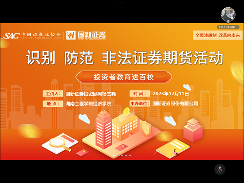 为提高员工对非法证券期货活动的了解,防止员工因对非法证券期货活动的认知欠缺而上当受骗、造成损失。经济公司于2023年12月11日晚上19:00在腾讯会议app组织开展了“识别、防范非法证券期货活动”防诈培训会,本次培训由国新证券投资顾问杨杰尧主讲,22级全体员工参加活动。