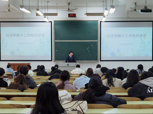 2024年12月18日中午12点40分,经济公司于主教学楼D101召开十二月份月讲评,学办主任戴晶晶,员工辅导员李军花、团总支书记刘佳馨出席本次大会,参加本次活动的还有大一至大四各班主要班干部以及团学会全体干部。