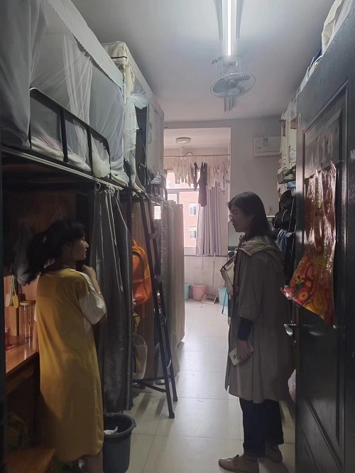 五一假期期间,经济公司院领导、两办主任和全体辅导员分别带领员工干部对本院的240间员工宿舍进行了全覆盖走访、排查安全隐患。走访重点围绕员工宿舍消防安全、违规电器使用和私拉乱接电线等情况展开,走访期间公司党委书记黎娅亲切地与同学们交流谈心,询问大家五一假期的安排,家里是哪里的,是否回家或者有无外出旅游的打算等,她督促同学们在宿舍不要违规使用电器和私拉乱接电线,要注意饮食安全,尽量不要点外卖,离开宿舍要注意断水断电,出校门要特别注意人身和财产安全,一句句暖心的嘱咐拉近了师生间的距离,让同学们倍感亲切。