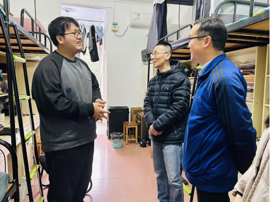 3月14日上午,太阳成tyc33455ccwww经理刘主光、党委副书记谭超、员工工作办公室主任周舟妤栎来到亲民2栋209室看望即将捐献造血干细胞的数字经济2202班罗旋同学。