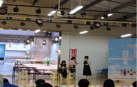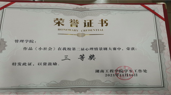管理公司心理部为第三个出场。剧组全体成员在前一个剧目结束前就已在后台候场,并做好演出准备。演出过程中演员们认真表演,充分展现个人对角色的理解,报幕间隙,后勤人员及时更换舞台道具,保证演出的顺利进行。《小社会》主要讲述了来自山村的老员工陈天在勤工俭学过程中感受到的人情冷暖。《小社会》有利于解答初入大学的同学们的疑惑,帮助他们尽快适应老员工的身份与所处环境。《小社会》以贴近生活的故事情节与演员们认真专注的表演得到了评委的欣赏,以94.1的分数获得此次心理情景剧大赛的三等奖。