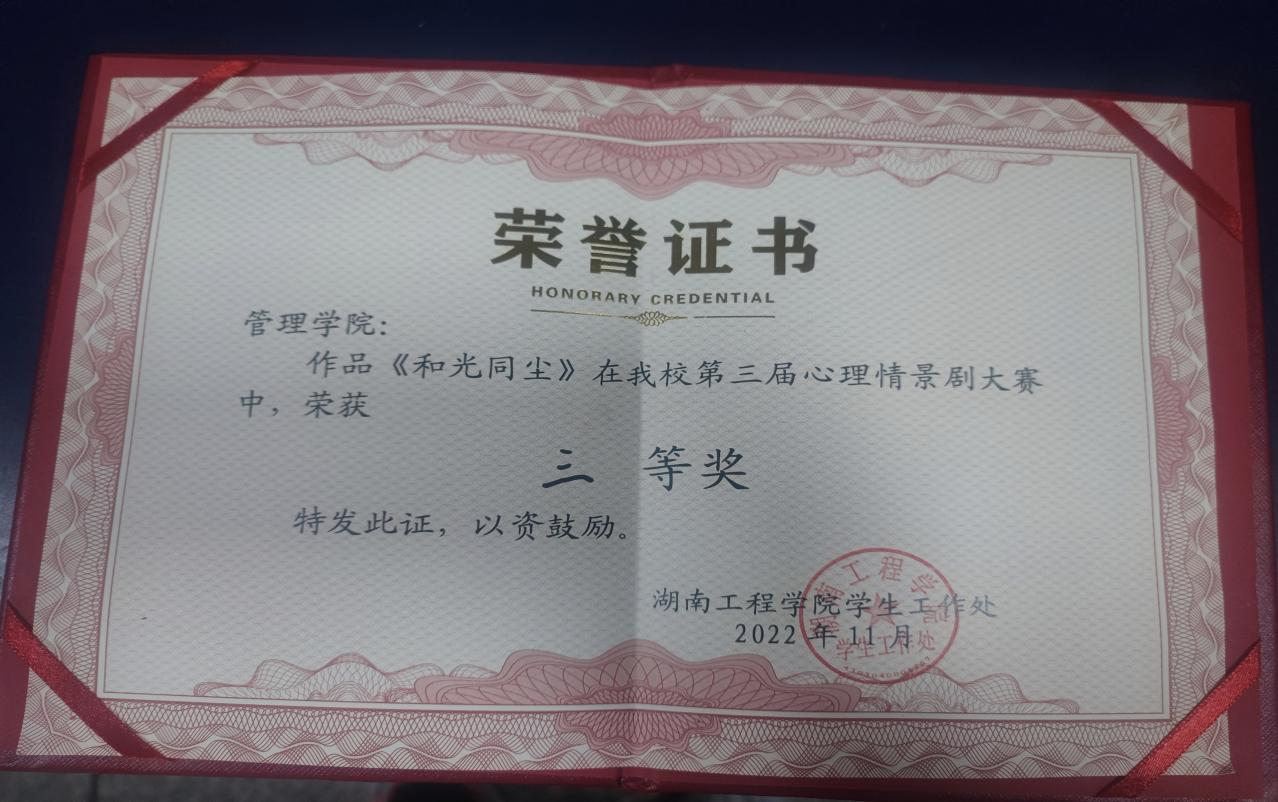 图2:管理公司《和光同尘》心理情景剧大赛奖状