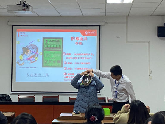 接下来,教官介绍了常规消防设施的使用,并现场演示了防毒面具、灭火器的正确使用方法,还邀请老师上台体验,让大家对消防知识有了更直观的了解,如此的互动更增加了大家对消防工作更深层次的认识及对消防安全的重视程度,给讲座划上一个圆满的句号。