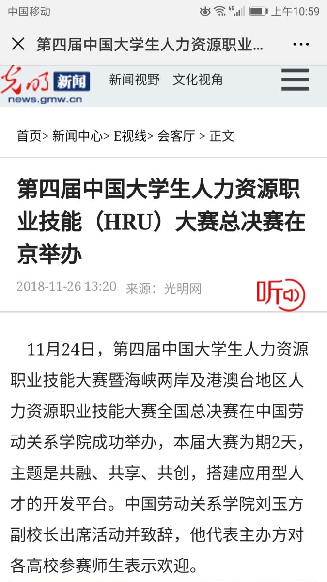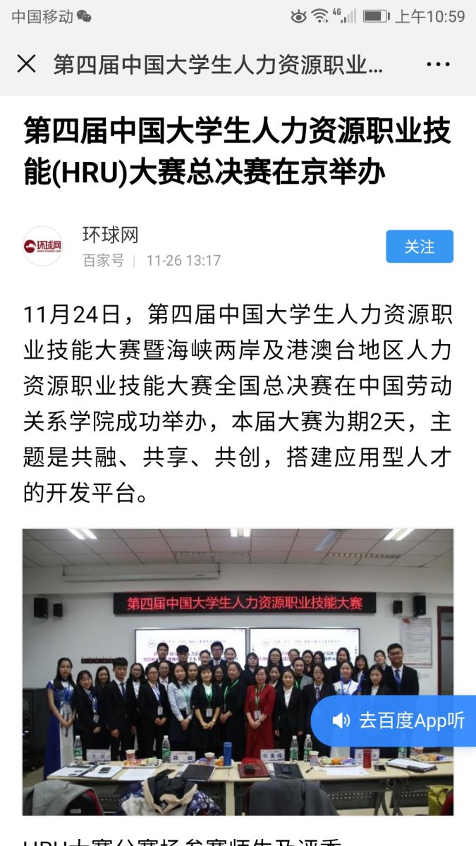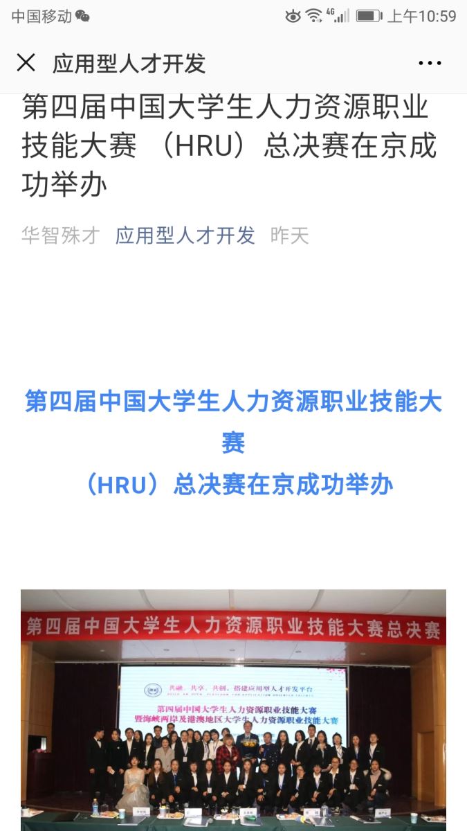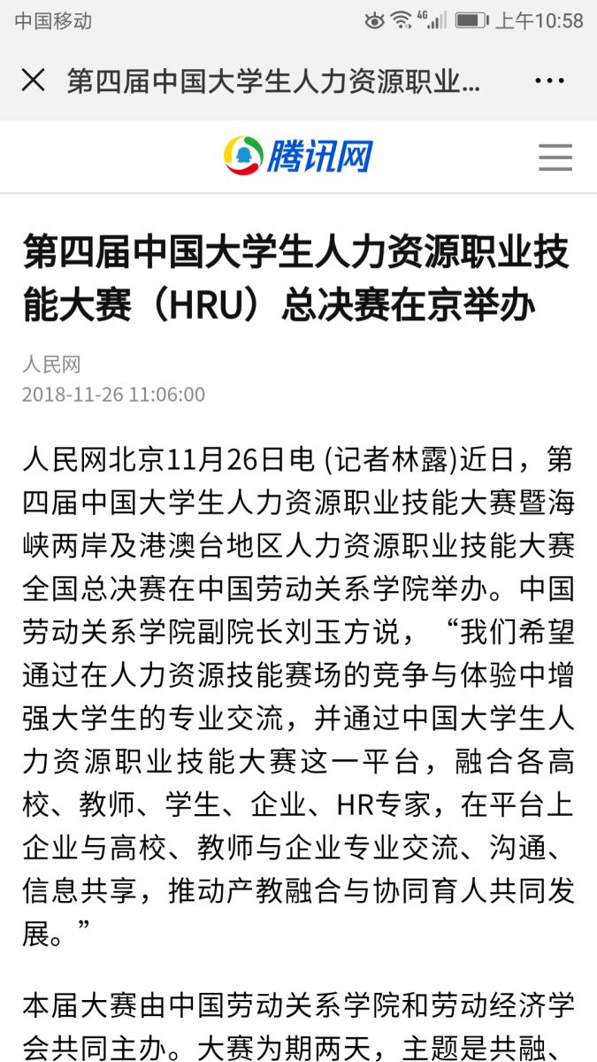 11月24日,第四届中国老员工人力资源职业技能大赛暨海峡两岸及港澳台地区人力资源职业技能大赛全国总决赛在中国劳动关系公司成功举办,本届大赛为期两天,由管理公司曹哲文老师带队指导的,人力资源15级张子鸣、文博涵,全湘君,向红四名同学组成的公司代表队参与此次赛事。经过为期两天的专业比拼,公司表现突出,荣获团体二等奖,其中曹哲文老师获优秀指导老师奖,张子鸣、文博涵、全湘君获单项二等奖,向红获单项三等奖。