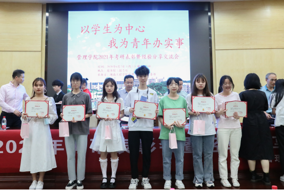公司党委书记余博宣读《关于表彰管理公司2021年优秀考研毕业生的决定》;市场营销1701班徐诚同学代表考研优秀员工作交流发言;人力资源管理1801班孙瑞晶同学代表2022届考研学子作考研动员倡议;罗小青分享自身奋斗经历鼓励学弟学妹们要笃定目标,风雨兼程,在考研征途上实现人生新高度,将考研作为大学四年学业生涯的检验场。