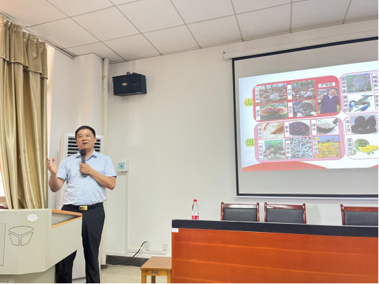 报告中,邓述东向师生们回顾了科技致富、创新脱贫模式的历程,勉励师生厚植家国情怀,刻苦学习科学知识,用聪明才智和辛勤汗水奉献祖国。在引领村民脱贫致富的道路上,邓述东长期摸索,艰辛实践,不断创新,逐步实现了从脱贫攻坚“一亩田脱贫”模式向乡村振兴过程“深耕一亩田”模式的转换与升级。邓述东满怀期待地介绍了“稻田澳虾”“莲田甲鱼”“赤松茸+黑花生”“林下竹荪”“莲/稻+特色水产”的十个特色综合种养模式等多项新品种、新技术、新模式。他表示,“深耕一亩田”的目的就是围绕“用好农村四处地 唱好农时四季歌”不断探索,让“山水田土有产业 春夏秋冬有收获”,使“深耕一亩田”成为乡村振兴产业发展的百宝箱。