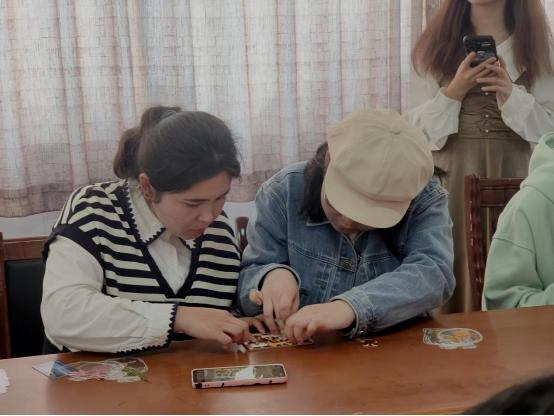 活动以“文化长廊”形式展开,设有“丝路书韵”透明手工书签创作环节,“大美新疆”拼图挑战和“翰墨同心”国风书法书签创作三大特色环节。在“丝路书韵”创作环节,透明塑料片、干花、彩绘贴纸等材料化身文化交融的媒介,同学们在工作人员的指导下,充分发挥想象力,将这些简单材料组合成精美的透明书签。制作过程中,大家互相交流创意,现场气氛热烈,欢声笑语不断。这一环节不仅锻炼了同学们的动手能力,更在轻松愉快的氛围中拉开了文化交流的序幕,激发了同学们对文化创作的兴趣。“大美新疆”拼图挑战环节,通过高清风景图与艾德莱斯绸纹样拼图的组合,生动还原了新疆自然风貌与文化符号背后的历史故事,“这些纹样不仅是图案,更是民族智慧的密码。希望大家通过亲身体验,了解‘多元一体’的文化基因,筑牢中华民族共同体的精神根基。”公司学风专干彭小玲如是说。“翰墨同心”国风书法书签创作环节,则以《兰亭集序》《黄州寒食帖》等经典书法作品为载体,师生共同欣赏品鉴、挥毫泼墨,将美好愿景凝于笔端。