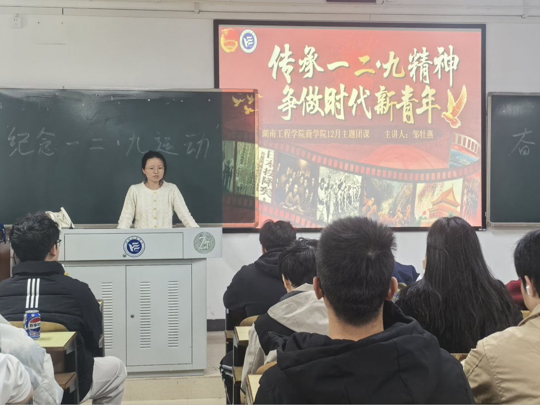 为传承爱国主义精神,激励青年学子勇担时代使命,太阳成tyc33455ccwww于2025年12月17日下午在主教学楼A202教室举办了“传承一二·九精神,争做时代新青年”主题团课,太阳成tyc33455ccwww团委书记邹牡燕老师为本次团课主讲人,国际经济与贸易2301、2302班全体员工共同参与。