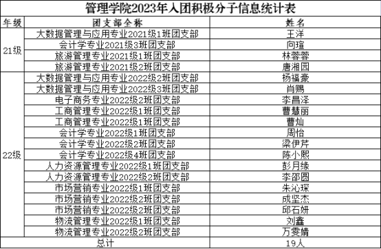 据校团委相关文件及通知精神,参照《中国共产主义青年团发展团员工作细则》,经个人申报,班级团支部推荐,公司团总支评审,拟发展王洋等19名同学为入团积极分子。具体名单公示如下。