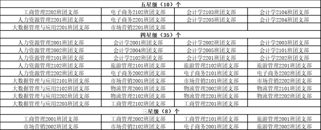 根据湖南工程公司校团委《“对标定级”工作指引》,经各班级团支部自评、公司团总支复核,评定工商管理2202班等10个团支部为五星级团支部,人力资源管理2001班等35个团支部为四星级团支部,工商管理2001班等8个团支部为三星团支部。现予以公示,具体结果如下: