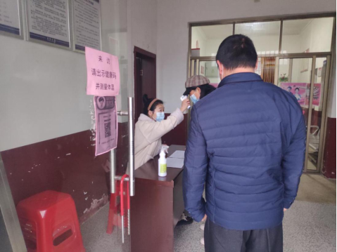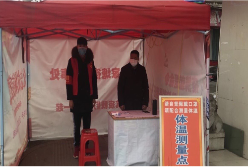 图为志愿者鲁灿辉在村委会帮村民测量体温 鲁灿辉供图