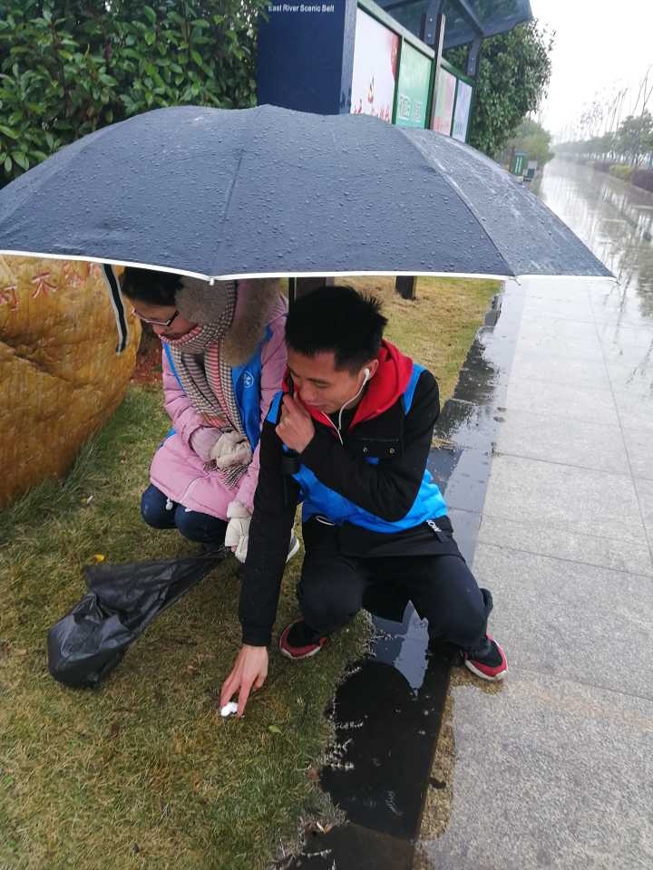 由于天气原因,此次的志愿活动开展的并不是很顺利,但是在寒冷的冬雨中服务社会却更展现出志愿者们坚忍不拔的意志。志愿者们互相配合,一人撑着伞,一人拾起地上的白色垃圾,槟榔渣,烟头,口香糖是志愿者们重点关照的“对象”,一蹲一起,足显二者之间的默契。