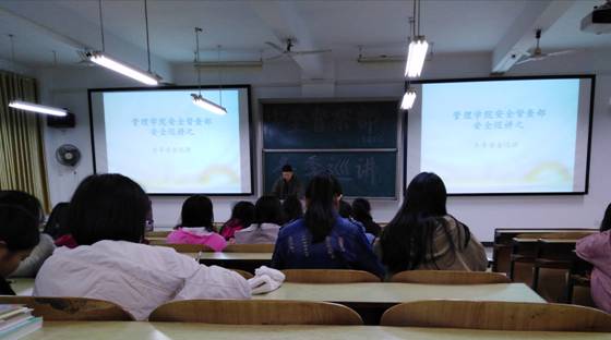 12月5日星期三晚自习,为了提高同学们冬季安全意识的美好初衷,管理公司员工联合会安全督察部在教学楼d栋303展开了以防火、防骗、防盗、警惕校园贷等多个主题的安全巡讲。