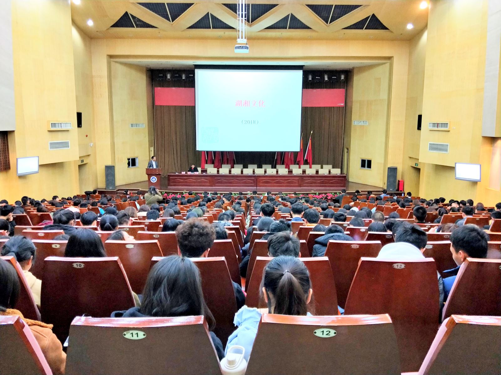 郑教授着眼于湖南的风土人情,从各个方面向同学们详细的讲述了湖湘文化的内容。首先,郑教授开篇引出因湖南自古盛植芙蓉,故得“芙蓉国”之称,更有古诗“秋风万里芙蓉国,暮雨千家薜荔村。”让世人记住了湖南。之后,郑教授从湖南极富诗意的地名入手,引出了湖南地区的湖湘文化,列举“潇湘八景”和“潇湘馆”详细描述,从小着手引出大内容,让同学们对湖南地区的文化有了进一步的了解。