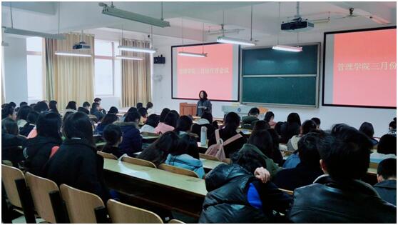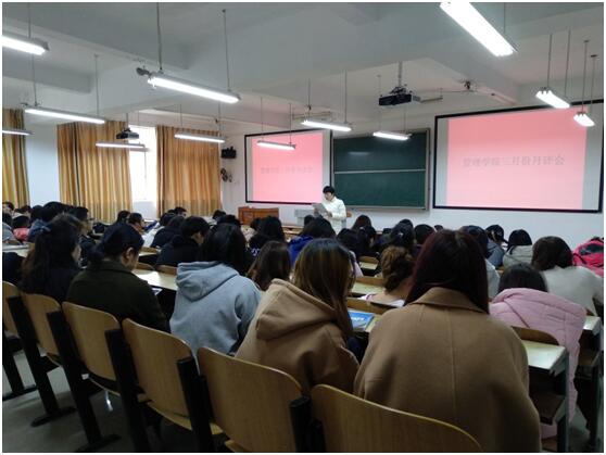 3月21日中午12:10,管理公司大一大二单学号同学,大三班委,大四班长在主校区教室内进行本学期第一次月评会议。学办辅导老师罗荃、黎博、单艳艳、包海燕、周艺、宋志航对工商管理、旅游管理、人力资源管理、会计学四个专业进行讲评,本月心理会议也同月评会同一时间顺利展开。