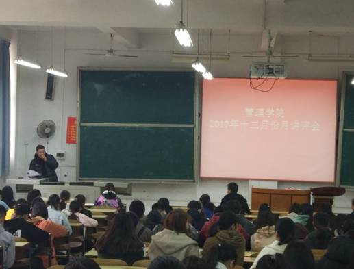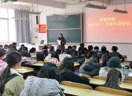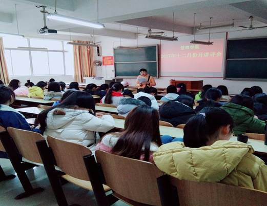 2017年12月12日中午12:10,管理公司大一大二双学号同学,大三班委,大四班长、学委、团支书,在主校区教室内进行本学期第四次月评会议。学办辅导老师罗荃、黎博、单艳艳、包海燕、周艺、宋志航对工商管理、旅游管理、人力资源管理、会计学、物流管理、市场营销六个专业进行讲评,本月心理会议也同月评会同一时间顺利展开。