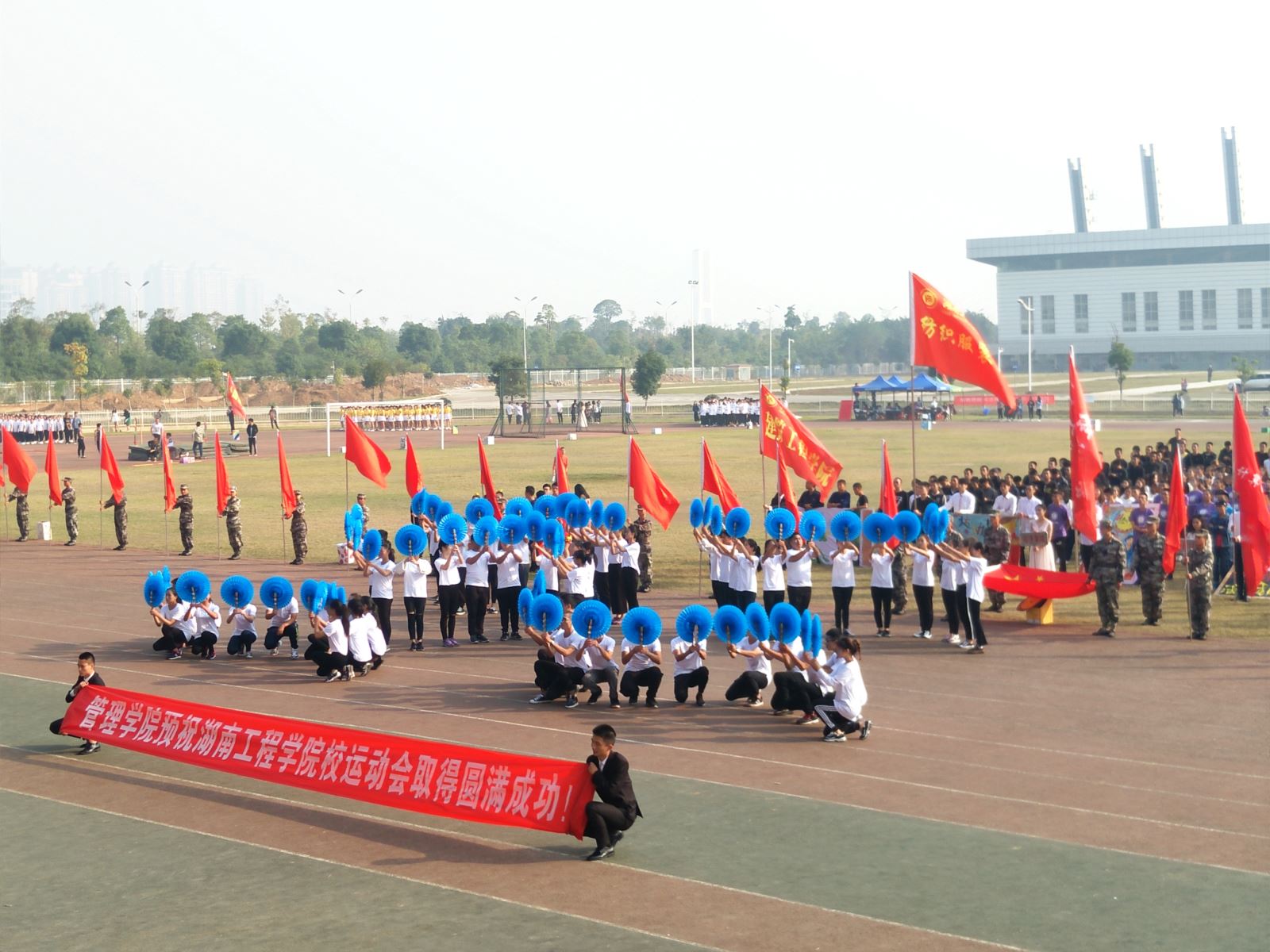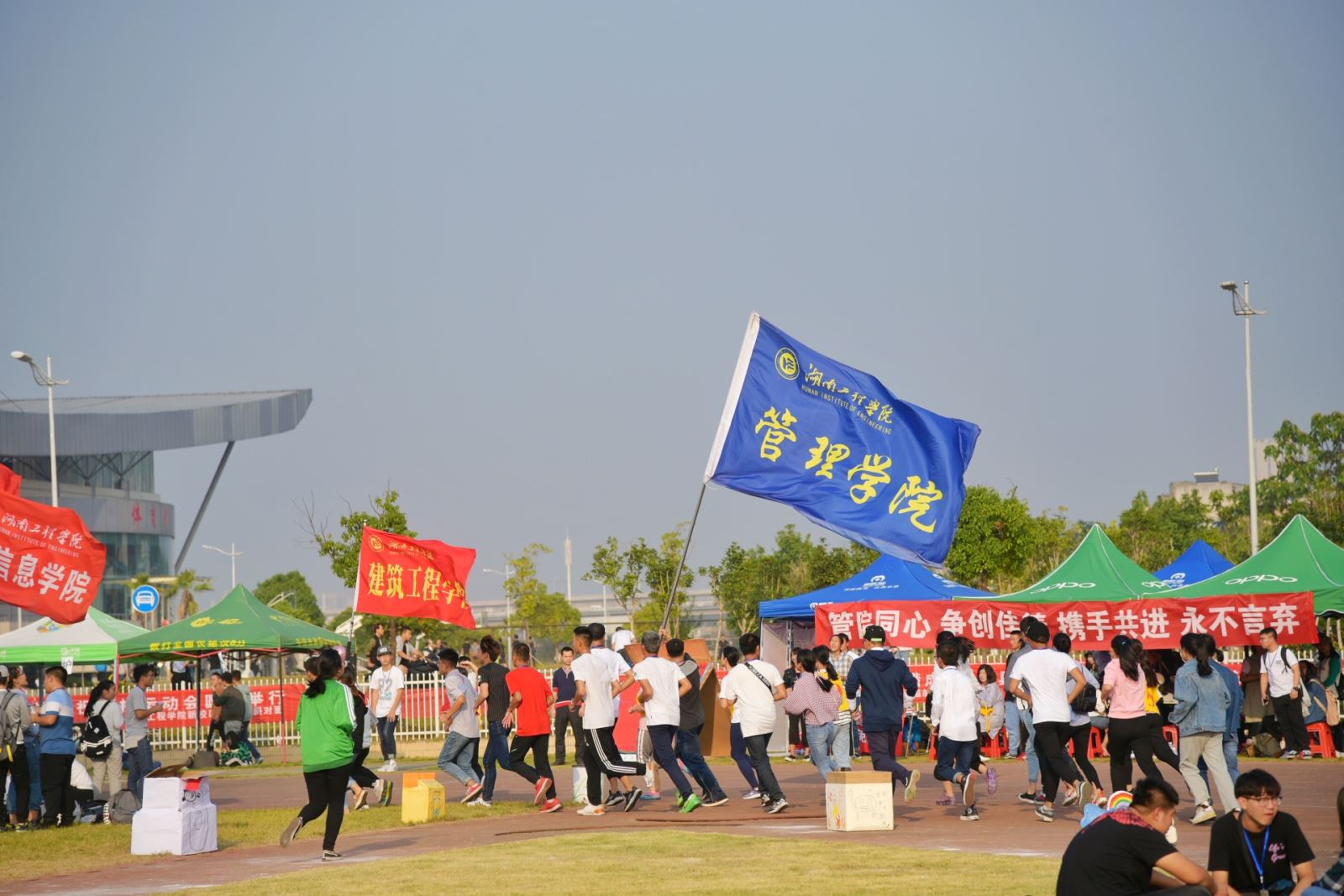 10月27日,湖南工程公司秋季运动会如期开展,开幕式上,管理公司方阵,步伐矫健,整齐干练,舞蹈部分也十分醒目,很好的诠释“管理英才,继往开来;管院雄风,谁与争锋”的口号!秋风飒爽,骄阳高挂,运动们热情洋溢,大家都积极担当“拉拉队”,加油助威声此起彼伏。