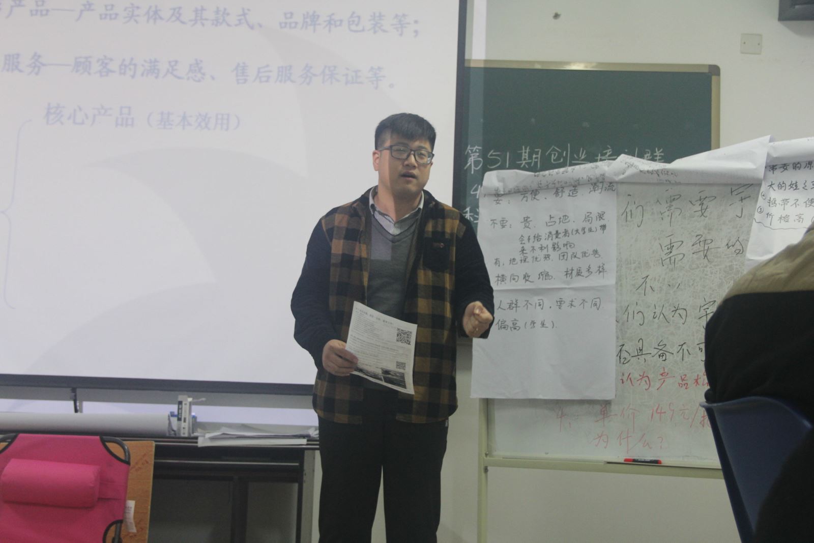 此次课堂以“市场调研和营销策划”为主题,段老师清晰而富有感染力的话语,传授着创业经验和方法。并提出了“人无我有,人有我优,人优我新,人新我特”的倡导,激励着湖南工程公司学子创业的激情和信心。本次邀请到公司SIYB 创业培训第36期学员陈联祥分享创业经历。今年陈联祥和他的创业团队创立了宇宙大学公司,推出了第一款具有国家实用新型专利的产品“宇宙大学椅”,陈联祥现场介绍演示了该产品的性能和用法。在老师们的讲授和指导下,大家根据课堂主题结合“宇宙大学椅”产品的营销积极讨论、相互交流、引爆创意火花。理论联系实践很好地达成了本次课堂教学的目标,激励了湖工学子的创业,也为正在拼搏的创业学子提供了有益的帮助。