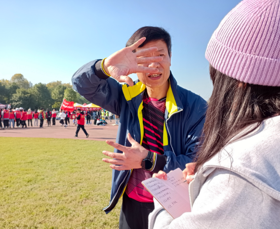 采访时,文老师说他每年都有参加运动会的铅球项目,所以比赛时并没有紧张的感觉。当被问到此次运动会与往年有何不同时,他说今年天气比以往都要好,同学们也非常的热情,这样能更好的促进老师与同学之间的交流,也能让同学们看到老师不一样的风采。最后,他向我们介绍了一些铅球项目的知识,铅球是一个技术性非常强的项目,运动员需要有很好的腰腹控制能力与腿部核心力量来保证铅球的掷出,控制好手掌握球的角度和力量也至关重要。