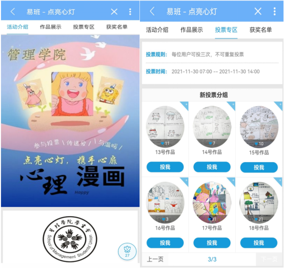 本次活动首先由心理部根据摆点投票和评选团投票结果,确定18个在易班APP上展示的作品材料转至易班管理中心,易班管理中心在易班APP上搭建好平台,管理公司全体成员在11月30 日积极为自己心仪的作品进行投票。此次活动公司同学积极参与,最终经过激励而精彩的角逐,本次心理漫画活动获奖名单如下: