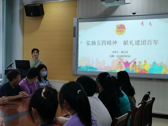 为深入学习贯彻落实习近平总书记在中国人民大学考察调研时的重要讲话精神,提高新时代青年团员的政治思想觉悟,弘扬五四精神,发挥团组织的示范引领作用,加深广大青年团员对百年团史的全面理解,展现新时代青年良好精神风貌。2022年5月5日,管理公司团总支在F104组织开展“弘扬五四精神献礼建团百年”主题团课。团课由管理公司团总支书记彭小玲主持,全体员工干部参与。