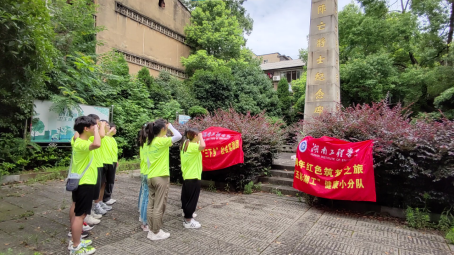 纪念碑矗立于一座小小的院子,四周绿树环绕,寂静肃穆。一行人怀着对英烈的敬仰之情,踏入小院,向革命先烈鞠躬,缓步绕行纪念碑,缅怀革命先烈。带队老师向团队成员讲述了抗日战争时期,湘军浴血奋战、守卫湖湘的故事,队员们备受感动。随后,实践团一行在纪念碑前重温入团誓词。