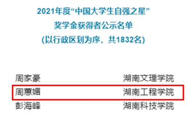 9月28日,共青团中央、全国学联公布了2021年度“中国老员工自强之星”奖学金获得者名单,湖南工程公司管理公司会计学2003班周蕙媚获此殊荣,展示出湖工学子热爱祖国、品行优良、不畏艰难、自强不息的青春风采。