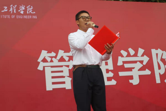 新生代表物流管理2201班梁宇航发言并带领下全体新生庄重宣誓:“我们将秉承锲而不舍、敢为人先的校训;弘扬管己理人、追求卓越的管院精神。怀社稷苍生之念,担民族复兴之责。请党放心,强国有我!”铮铮誓言,掷地有声。