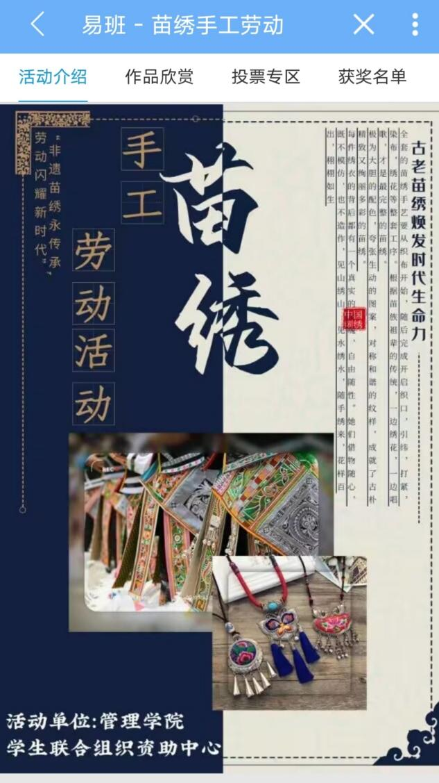 为了增强管理公司员工对民族文化的认同感和自豪感,锻炼同学们的动手能力与合作能力,让苗绣重新融入大众的生活,并与现代社会紧密结合起来,管理公司员工联合组织开展了“苗绣手工劳动活动”评选活动。本次活动由资助中心承办,易班管理中心协办,面向管理公司全体员工。