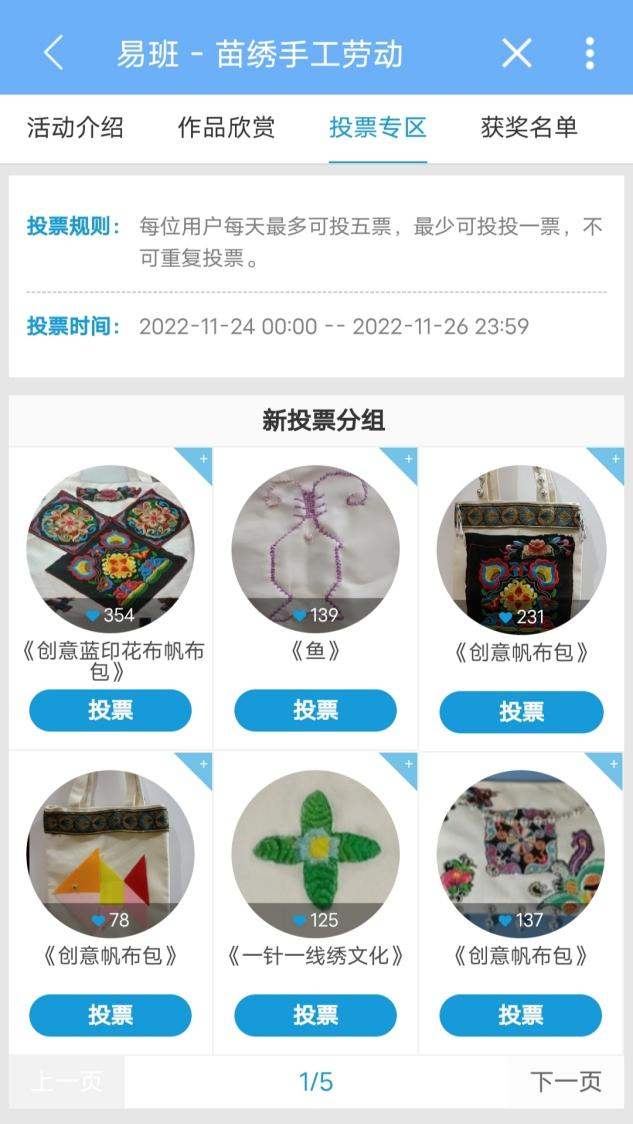 本次活动由资助中心准备好活动过程中要用到的材料、布置活动场地、收集参赛作品,并将作品拍照转交给易班管理中心。其次,易班管理中心搭建轻用快搭平台。同学们于11月24日—26日对自己心仪的作品进行投票。活动结束后,由资助中心为获奖选手颁发证书。在公司同学的积极参加和热情投票下,最后根据得票情况评选出特等奖两名,一等奖一名——TTLYZ队《创意蓝印花布帆布包》,二等奖两名——苗绣小天才队《冰墩墩》、今天也要加油队《苗绣小背心》,三等奖三名——爱会消失对不队《创意帆布包》、今天也要加油队《喵喵喵蝴蝶绣》、锦绣山河队《望舒曦和》。