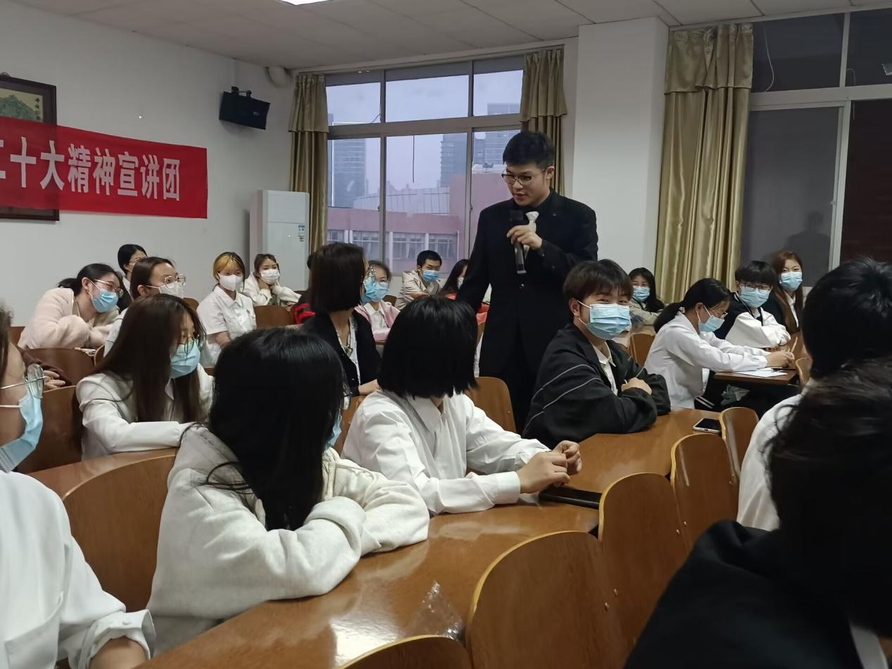 为深刻阐述党的二十大思想内涵、核心要义和实践要求,引导广大青年用党的最新理论知识武装头脑,在深入学习中践行报国使命,奏响时代强音,彰显青春担当,5月11日晚,“红色青春”党的二十大精神宣讲团于管理公司开展专题宣讲。本次宣讲由校团委主办,管理公司团总支承办。校团委书记刘琤,管理公司党委副书记谭超出席,校团委相关负责人、管理公司教师代表及40余名优秀团员青年代表参加宣讲会。