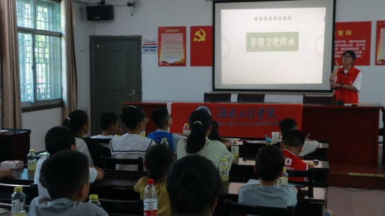 在张谷英村,实践团成员为村里留守儿童开设公益课堂,在课堂上讲解了非遗文化知识、防溺水安全常识、普通话发音技巧以及党史知识。实践团成员讲解深入浅出、活泼生动,课堂氛围热烈,获得了小朋友和村干部的一致好评。“哥哥姐姐,你们明年还来吗?明年再教我们念绕口令可以吗?”上课结束后小朋友们围着实践团成员不舍地问。