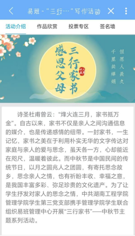 此次活动共历时18天,活动伊始,由易班管理中心下发有关活动通知,组织管理公司各专业员工踊跃报名参加,员工第三支部党员带头参与,积极投稿。随后,易班管理中心部门成员筛选出优秀作品并完成平台的搭建,同时将优秀的家书作品上传至管理公司微信公众号进行公开展示并同步搭建易班app进行投票展示。参赛者在作品中这样写到,“等一等,等绿叶成荫,轮到你们当小孩。”如其言,员工们以此次活动作为契机,让对家人的感恩之情流露在纸面上,赋予文字以情感,以文字来传达感情。