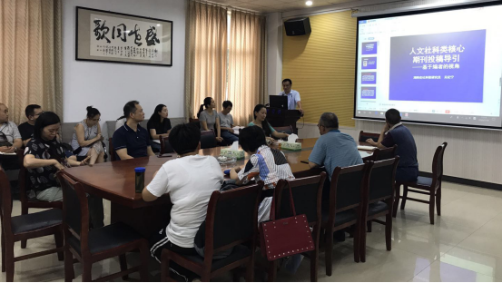 2020年7月10日下午,管理公司特邀湖南省社会科学界联合会《湖南社会科学》杂志社吴纪宁主编在F-104举办《人文社科类核心期刊投稿导引》讲座。管理公司经理徐运保、副经理黄毅、潘立军及各相关公司老师参加本次讲座。
