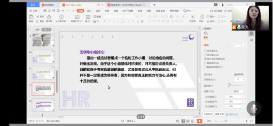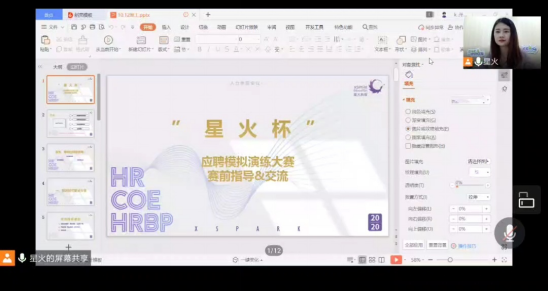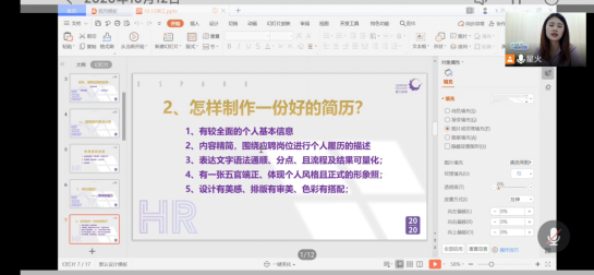 10月12日晚七点,由湖南工程公司管理公司主办,管理公司就业服务部承办的应聘模拟演练大赛赛前指导以线上的形式,在腾讯会议进行,本次赛前指导,由珠海星火英语企业高管贺佳盈担任主讲人。贺佳盈,珠海星火教育培训中心有限公司人力资源部招聘主管,贺佳盈在星火英语有着五年的工作经历,每天的工作时间内会接受、审核数十封简历,面试经验可谓是十分丰厚。贺佳盈在正式进行培训前,从三个角度进行切入,从应聘的目的、应聘的流程再到应聘的礼仪,讲解内容深刻,声线清晰,声情并茂,并在最后与同学们进行了互动交流。