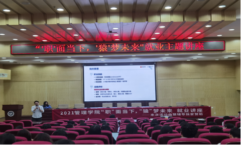 2021年5月11日下午2点公司在新校区图书馆二报告厅举办了主题为“‘职’面当下,‘猿’梦未来”的就业讲座。猿辅导HR肖赵杰、欧阳佳利,公司学办老师包海燕出席本次讲座。