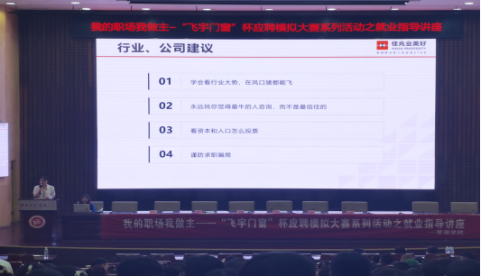 图为2021管理公司“飞宇门窗”杯应聘模拟演练大赛赛前指导讲座现场